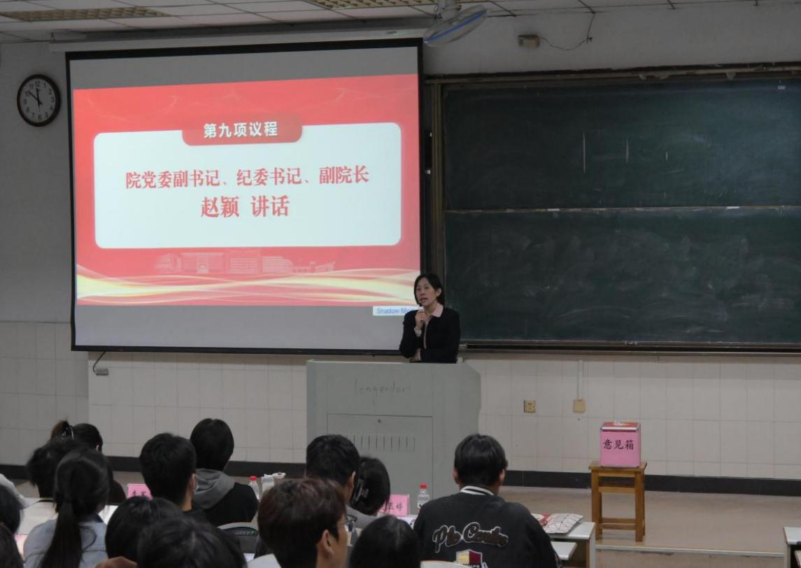 赵颖代表学院党委祝贺大会圆满成功,并向新当选的团学委员表示热烈祝贺。她向新一届团学组织及团员青年提出三点希望:一要深学细悟,筑牢思想根基,把个人理想融入国家发展大局;二要勤学笃行,练就过硬本领,在科技创新、社会服务中检验真知;三要勇担使命,矢志艰苦奋斗,以行动回应时代召唤、展现青年风貌。