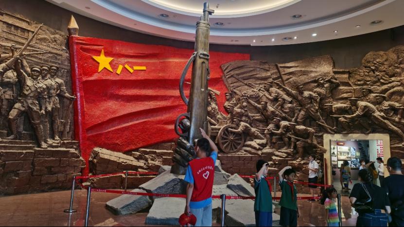 党的历史是最生动、最有说服力的教科书。带着对革命者的崇敬之心,实践队员们首先来到了“八一”南昌起义纪念馆。步入纪念馆,一组人物雕塑《一代英豪》便映入眼帘,纪念周恩来、贺龙、叶挺、朱德、刘伯承等五位南昌起义领导。进入序厅,大家更是为之深深震撼,一只强劲有力的大手,从崩裂的石块中伸出,扣动着直指苍穹的步枪的扳机——这座名为《石破天惊》的圆雕,生动地展现了中国共产党人不畏强暴、坚持革命,冲破“白色恐怖”,打响了武装反抗国民党反动派第一枪的场景。圆雕背景则是全国纪念馆中首创的大型组合雕塑,通过生动的人物形态和气势恢宏的艺术语言,多角度全景式的再现了南昌起义的全过程。队员们仔细聆听讲解员的介绍,在图片和实物前驻足细看,了解当时起义军艰苦卓绝的战斗历程,重温了“八一”南昌起义的燃情岁月,共同感悟革命先烈英勇无畏的战斗精神。
