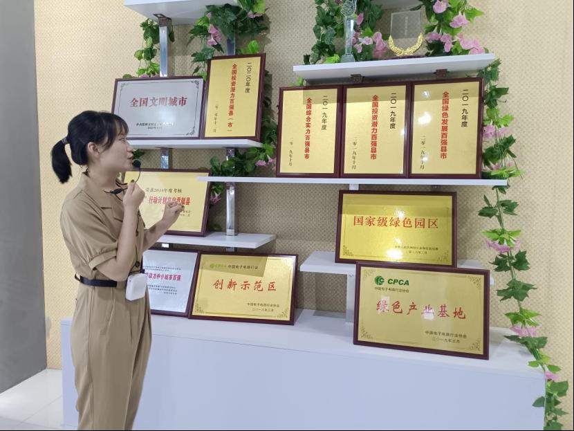 图为工作人员为实践队员介绍广德发展所取得的荣誉。